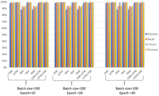 Table 7 shows that the Naive Bayes model achieved the lowest success rate with a 94.26% accuracy among all the models, while the MLP model achieved the highest success rate with a 99.950% accuracy. The highest result percentage is shown in bold. Among the deep learning models, the RNN model achieved the lowest success rate. In contrast, the Random Forest model achieved the highest success rate among the machine learning models. The results of the analysis conducted with the deep learning and hybrid models, based on the batch-size and epoch values, are presented in the column chart in Figure 13.
