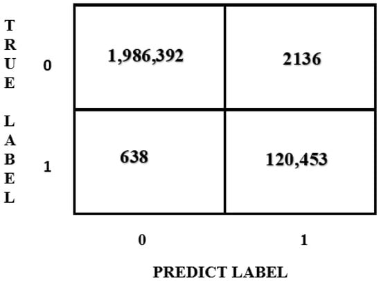 The confusion matrix, which is depicted in Figure 13, was created based on the MLP model. The confusion matrix displays the quantities of the actual values versus those of the predicted values. The dataset consists of 7,037,986 rows. Because 70% of the dataset is allocated for training and 30% for testing, the test portion comprises approximately 2,109,609 rows. The distribution of these rows used for testing the models is presented in the form of a confusion matrix in Figure 14, pertaining to the MLP model. (You can delete green table. We added new table. New table is below of green table).