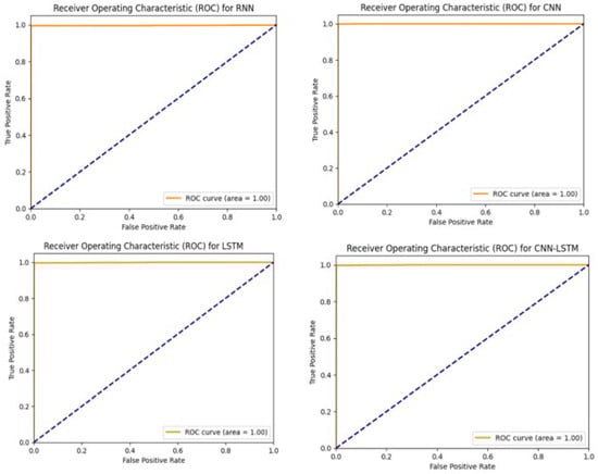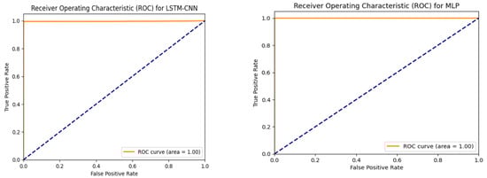 When the axes of Figure 15 are examined, the True-Positive-Rate (TPR) and False-Positive-Rate (FPR) values can be seen. These values provide information about the success of the study. A high TPR value and a low FPR value are desirable for achieving a high performance. If we define it on the graph, this means that for a high success rate, the graph should be positioned in the upper left corner. The closer the graph is to this position, the higher the success rate of the application. The graphs were created for the CNN, LSTM, MLP, RNN, CNN-LSTM, and LSTM-CNN models, which achieved the most successful results.