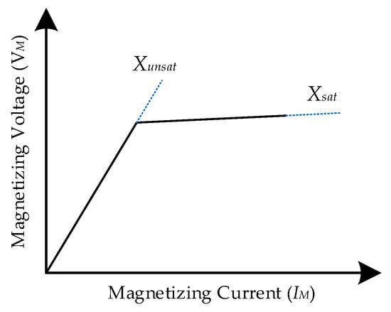Suppose the terminal voltage transformer exceeds the nominal value or operates at frequencies below the nominal frequency. In that case, the transformer may experience over-excitation [], which means that the magnetic flux in the ferromagnetic core is higher than its rated capacity, resulting in core saturation [,]. The transformer’s saturation curve represents the core’s nonlinear behavior; it represents the magnetizing current as a function of the terminal voltage. The nonlinear saturation curve can be simplified using piecewise linearization and is replaced by two regions with linear characteristics [], as shown in Figure 2.