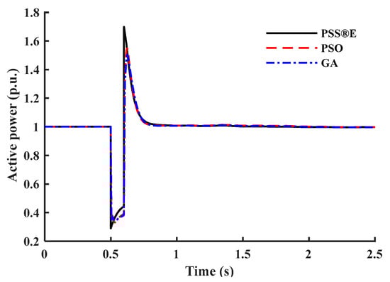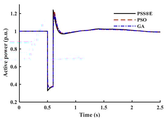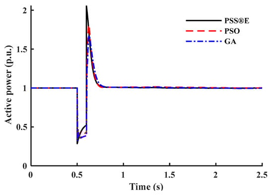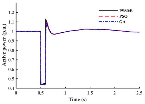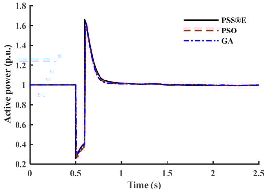 The estimated parameters of the large motor model are written in Table 2. Figure 4 and Figure 5 show the dynamic behavior of the large motor for the PSS®E model and the proposed model with tuned parameters using PSO and GA. Similarly, for small motors and the same supplied voltage shown in Figure 3, the estimated parameters of the small motor model are written in Table 3. Figure 6 and Figure 7 show the dynamic response of the small motor for both models.