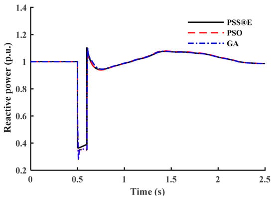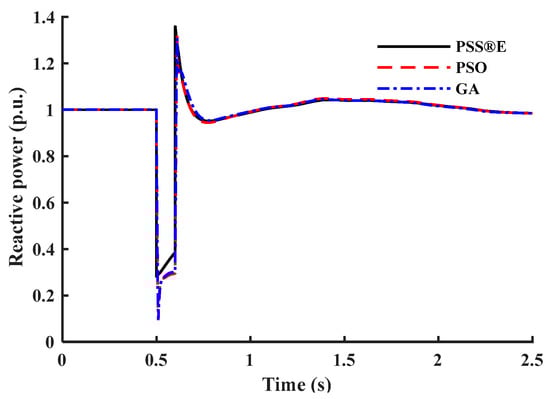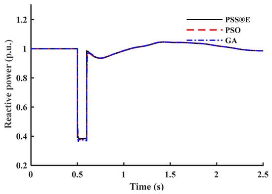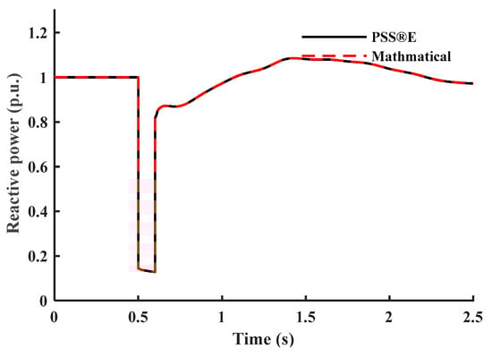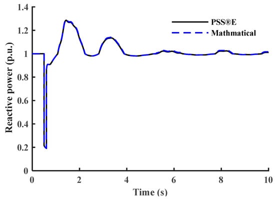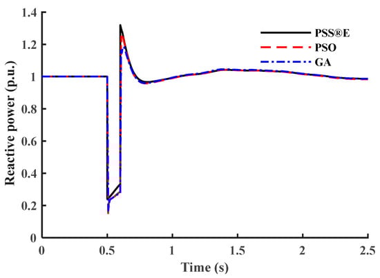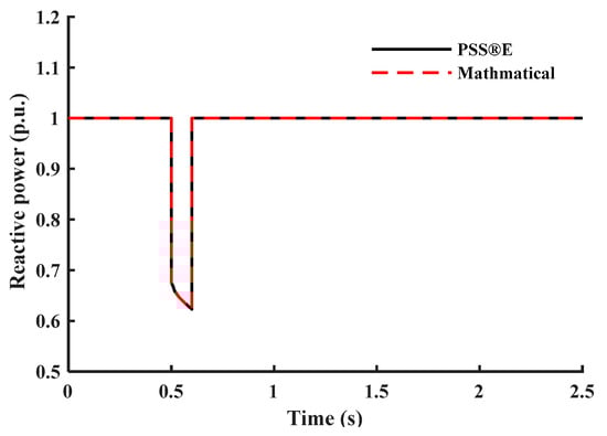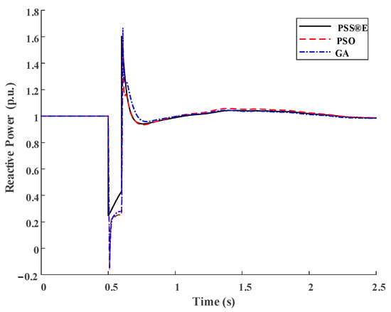 As mentioned, the effect of the saturation transformer on the active power is insignificant and can be neglected. Using the same procedure, the percentage of the saturation transformer load is set to 100%; then, the reactive power dynamic response is observed. It is important to note that setting the percentage of saturation transformer load to be 100% at a specific bus means that the model only captures the dynamic reactive power response of the saturation effects during transients.