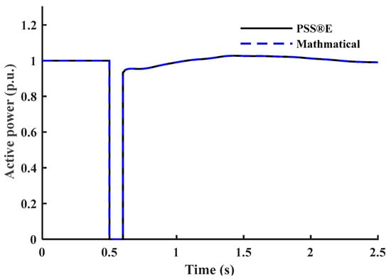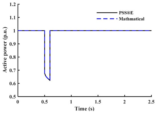 This subsection tests the proposed model’s capability to represent different load composite structures under different load structures. In the PSS®E CLOD model, the load composition percentages are considered the model’s input parameters. Four different composite load structures are chosen randomly as test cases. Case I represents areas where motor loads are dominant, such as industrial circuits. Case II percentages are selected to represent the commercial class with different types of loads. Case III represents residential areas where discharge lighting and constant MVA loads dominate. Case IV percentages are based on WECC generic parameters of the CLOD model []. Table 7 provides the load composition structure for each test case. Figure 13, Figure 14, Figure 15, Figure 16, Figure 17, Figure 18, Figure 19 and Figure 20 show the outputs of both models. To highlight the accuracy of the presented models, Table 8 provides the IAE values for each test case. The IAE is always very low, so the presented mathematical models accurately represent the commercial model.