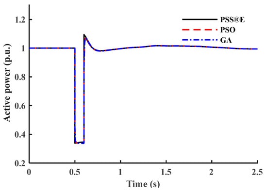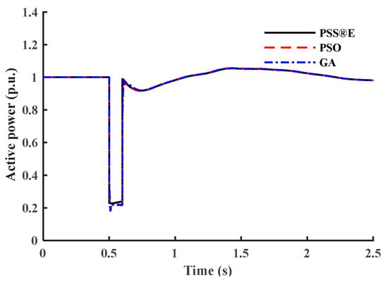 To validate the proposed model, PSS®E and the New England 68-bus, 16-generation, 5-area test case were utilized to produce voltage and power measurements at load busses during dynamic simulations. In our study, the power consumed by bus 46 is considered to be voltage-dependent based on the CLOD model. A three-phase bus fault was applied to bus 30 and cleared after 0.1 s. The voltage and active and reactive power of bus 46 are recorded and considered to be the baseline for the derived model. The mathematical model derived in the previous section is tested in MATLAB-V9.4/Simulink. The same input voltage is used for both models to validate the proposed model. The output of the derived model for each individual load is compared with that of the CLOD model embedded in the PSS®E software (version 9.4). Heuristic optimization techniques, including PSO [] and GA [], are used for parameter identification for large and small motor loads. Integral time absolute error (IAE) was considered as a performance indicator to assess the accuracy of the estimated parameters, as shown in Equations (23) and (24):