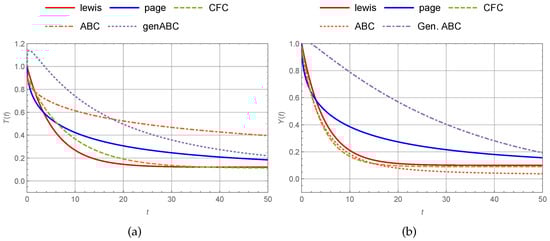 Upon examining Figure 1c, Figure 2c, Figure 3c and Figure 4c, we find that the ABC fractional derivative provides more precise results than the CFC fractional derivative as well as the Lewis and Page models. Furthermore, when we reduce the value of , the fractional derivative of CFC produces more accurate results than the others, as observed in Figure 1a,b, Figure 2a,b, Figure 3a,b and Figure 4a,b. Finally, as seen in Figure 5a,b, we found that the fractional derivatives of CFC and ABC produced more consistent results compared to the generalized fractional derivative of ABC under all conditions.