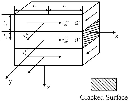 For an open crack, the axial tensile stress at the boundary of , and layers (1) and (2) under tensile load are