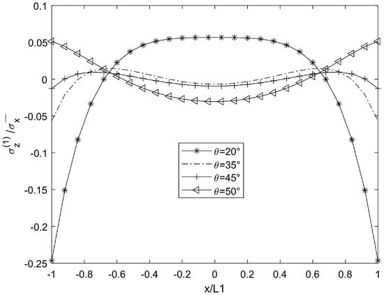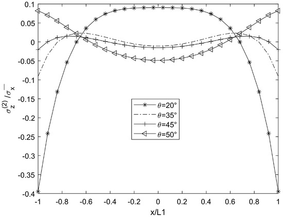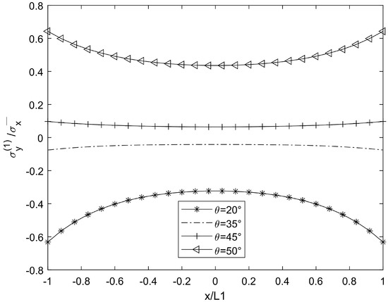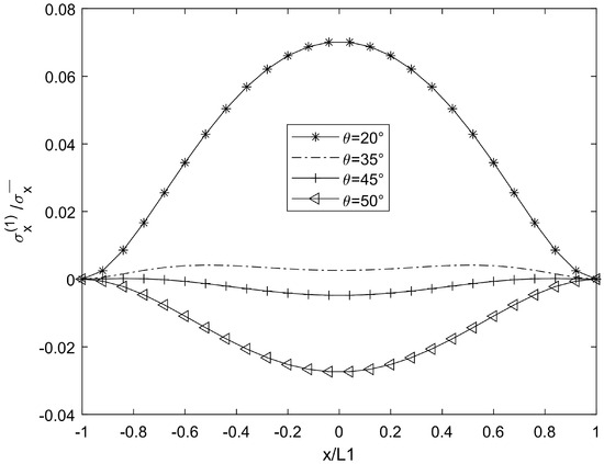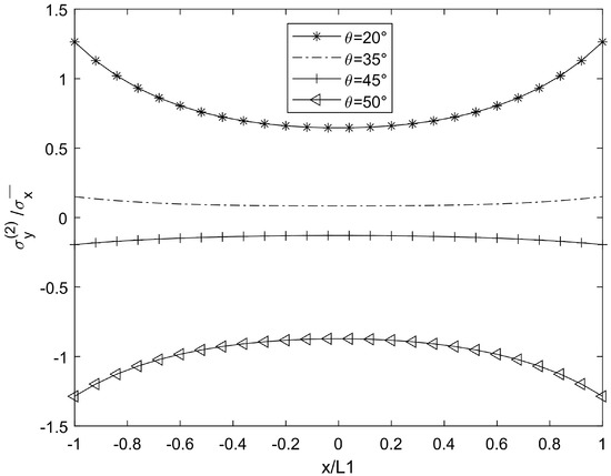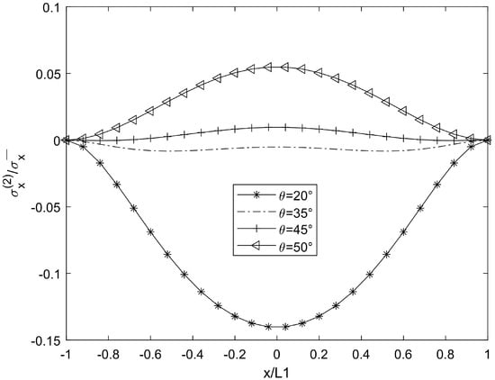For cases θ = 20°, 35°, 45°, and 50°, when the crack density is 0.5 (cr/mm) in the 90° plies, the material constant of the laminate is glass/epoxy 1, and the stress distribution results are shown in Figure 2, Figure 3, Figure 4, Figure 5, Figure 6, Figure 7, Figure 8, Figure 9, Figure 10, Figure 11, Figure 12 and Figure 13.
