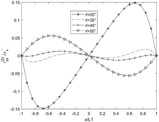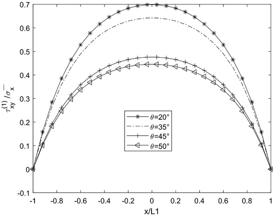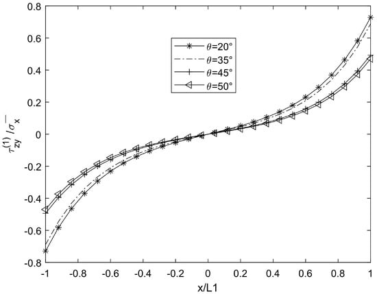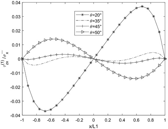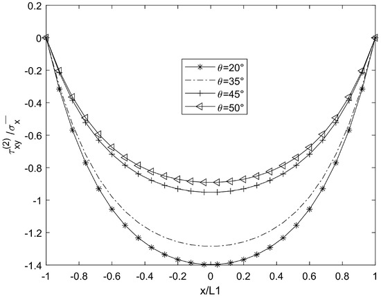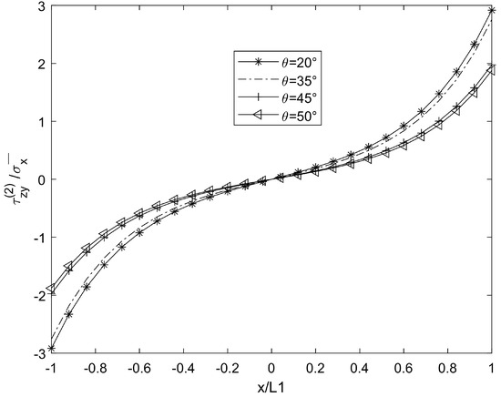 In Figure 7 and Figure 8, compared with the shear lag theory of Kashtalyan and Soutis [17], the predicted shear stress fluctuates nonlinearly when θ > 50°, which is consistent with the fluctuation amplitude of shear stress when θ = 50° in Figure 7 of this paper. However, this paper further reveals the modulation effect of interlayer constraint on the fluctuation amplitude using a variational method. However, according to the quadratic displacement hypothesis of Berthelot [16], the shear stress variation trend of the theoretical curve at a low θ value is consistent with that of the results in this paper (θ = 30°), and the difference appears in the high-θ-value region, which may be due to the finer interlayer coordination conditions of this model.