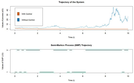 Note that the study of optimal control with semi-Markovian processes has been receiving attention since the last quarter of the 20th century, when it became clear that the exponential distribution cannot be considered as the basic distribution for the transition time in many cases. For example, in the work [], the optimization of the system in the presence of random shocks, which in turn are described by semi-Markov processes, is considered. The work gives an example of optimal replacement of the levels of the system and constructs a replacement algorithm for a countable set of states of the semi-Markov process. Models for finding the optimal general repair policy are considered in [], and the semi-Markov process in this case describes construction errors, and the policy change is based on minimizing the budget on the one hand and fulfilling all construction requirements on the other. In [], the authors considered the possibility of using semi-Markov models to solve the output-feedback control problem for general semi-Markov jump systems with a memory-dynamic event-triggered protocol. The authors of this article proposed a description of the system using a differential equation with a semi-Markovian component for the derivative of the process, i.e., the dynamics of the process will depend integrally on the dynamics of the semi-Markovian process. The main statements of this work provide sufficient conditions for the existence of optimal control for systems with semi-Markov parameters and an example of finding optimal control is given. A somewhat similar result for the case of asynchronous control was investigated in work []. The paper also provides several sufficient conditions for stochastic controllability of the system and considers a number of model examples with implementations of the semi-Markov process.