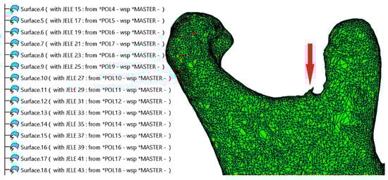 Following this initial simplification, the model was exported in .model format, consisting of approximately 150 distinct patches, each containing hundreds or thousands of triangles (Figure 1). These patches were highly detailed, with edge dimensions ranging between 0.3 mm and 1.5 mm, covering the entire mandibular surface. The authors meticulously ensured that all surface patches were connected, free of self-intersections, without missing triangles, and devoid of errors caused by the STL file export-import process.