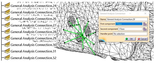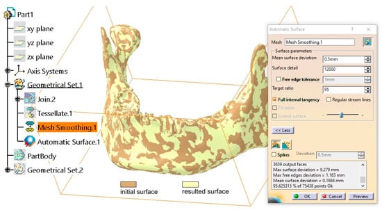 From the Quick Surface Reconstruction workbench, the Automatic Surface tool was applied with the following parameters: Mean surface deviation = 0.5 mm, Surface detail = 12,000, and Target ratio = 95 (Figure 3). This tool is adapted to various surface types, allowing for the reconstruction of complex geometries, and it can generate surfaces with or without complete internal tangency between adjacent faces.