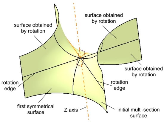 The pair consisting of the initial surface and its first symmetrical counterpart (highlighted in Figure 6) are then duplicated through rotation around two edges as well as the Z-axis. A rotation angle of 180° is applied to generate three additional surfaces, completing the intended structure.