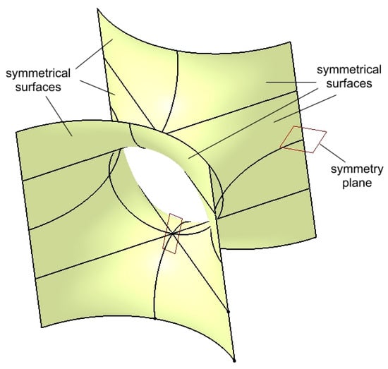 The group of surfaces shown in Figure 6 represents half of the main surface of the structure. To obtain the final surface, the group is mirrored with respect to a horizontal symmetry plane passing through any three points located on the upper edges.
