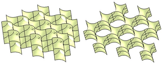 Numerous examples of surfaces exhibiting cubic, tetragonal, rhombohedral, and orthorhombic symmetries have been documented. Some of these surfaces can be parametrically generated using mathematical equations [], while others have been observed in nature, such as in biological membranes [], block copolymers [], and equipotential surfaces in crystalline structures [,]. However, some of these structures are highly complex and difficult to model or replicate in computational environments.