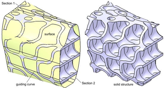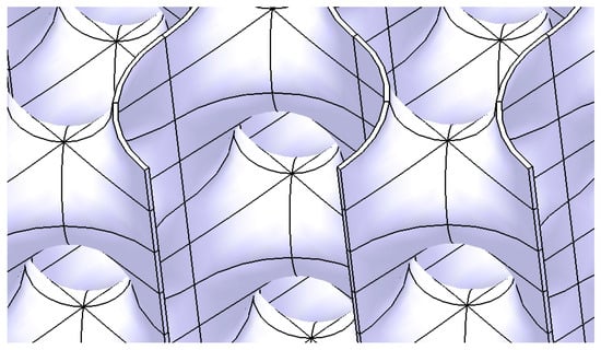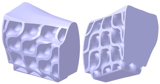 Given the construction methodology, including the curved surfaces, connection conditions, and tangency constraints between the component surfaces, the resulting structure can be classified as a hollow lattice structure (Figure 9). Such lattice structures are characterized by their lightweight design, high customizability, and favorable mechanical properties, primarily due to their hollow rounded geometries, as discussed in the review by Chibinyani et al. [].