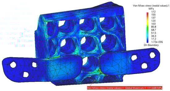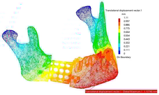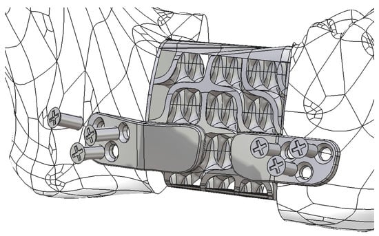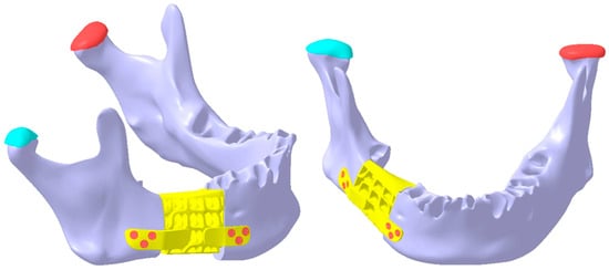 To achieve secure fixing of the reconstruction onto the mandibular bone, the structure depicted in Figure 11 is further reinforced with two integrated plates. These plates are custom-designed to match the patient’s mandibular anatomy in the contact region, with a width of 6.9 mm and a thickness of 1.2 mm, as determined by previous analyses published in an earlier study []. The reduced thickness of these plates contributes to enhanced patient comfort.