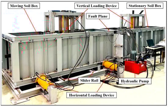 The platform was designed for strike-slip fault crossings based on the relevant basic dimensions, stability, and interchangeability. The platform comprised primarily the stationary soil box, moving soil box, slider rails, vertical loading devices, and horizontal loading devices. The fault angle was 90°. The horizontal loading devices enabled the moving soil box to slide along the slider rails to simulate displacement at the strike-slip fault crossing. The vertical loading devices were composed of jacks and compression plates. The compression plates resting on the pipeline–soil system applied pressure to the soil mass with the aid of the jacks to achieve the required stress similarity ratio. The entire platform is shown in Figure 2.