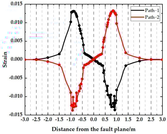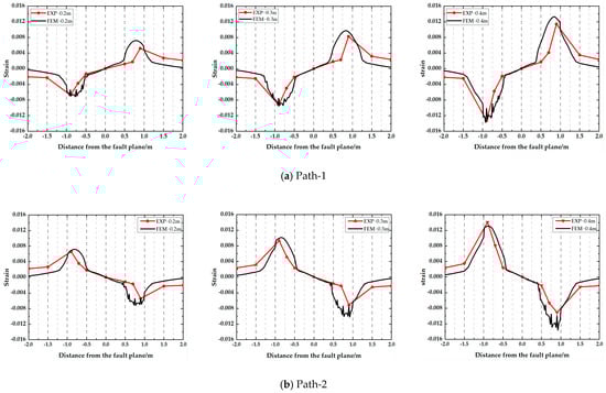 The model experiment data were extracted as a basis for drawing strain distribution curves corresponding to the two paths in the pipe’s axial direction in different scenarios of fault displacement. To mitigate the influence of uncertainty factors, we conducted four identical experimental trials and calculated the average of the corresponding results. The curves were compared with the FEA results under model working conditions.
