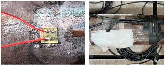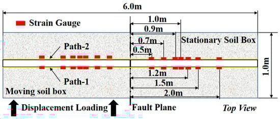 Because the pipe’s axial strain was primarily distributed within 0.5–1 m from the fault plane, as shown by the simulation results under the experimental conditions, sensors were more closely deployed within the range, and only a few sensors were deployed within the remaining part within a 2 m distance from the fault plane. Based on FEA results under experimental conditions, the maximum axial strain in the pipe is predominantly distributed within 0.5-1 m from the fault plane. Accordingly, a higher density of sensors was deployed in this critical zone, while only a limited number of sensors were placed in the remaining section (2 m from the fault plane). The strain test involved a 120-10AA foil strain gauge with a resistance of 120 ± 1 Ω, a sensitivity of 2.0 ± 1%, and a range of 20,000 με. The sensors were deployed as shown in Figure 6, and the sensor installation strategy and protection scheme are shown in Figure 7.