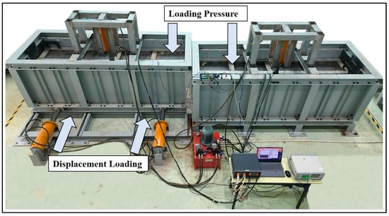 Following the initialization of the model experiment, the complete experimental system was installed and made operational. First, soil loading was commenced using vertical loading devices until soil stress reached the prescribed stress similarity ratio (0.04 MPa). Subsequently, the hydraulic system was switched to the pressure maintenance mode. Second, the moving soil box was loaded using the horizontal loading devices in a way that dislocated the moving soil box from the stationary soil box. The boxes were loaded until 0.4 m, with 0.1 m at a time. The loading operation for the experiment system is shown in Figure 8.