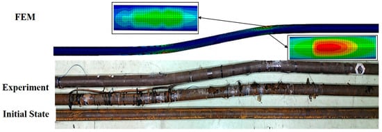 The pipe was lifted out of the soil after the loading experiment and strain data collection. The data were compared with the FEA results under the experimental conditions to obtain the details of pipe deformation under fault displacement, as shown in Figure 9. It was observed that due to fault displacement, the model pipe underwent evident deformation at locations largely distributed antisymmetrically, with the greatest strain occurring at a certain distance from the fault plane. Plus, in terms of deformation, the model pipe exhibited the same phenomena as in the FEA, indicating that the FEA can reflect pipe deformation under fault displacement satisfactorily.