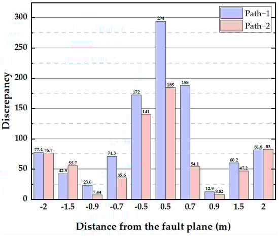 The discrepancies between the simulation and experimental results for 0.4m displacement loading are demonstrated in Figure 11. The discrepancy value at 0.9m from the fault plane is smaller, while the discrepancies are larger closer to the fault surface. Combined with Figure 10’s analysis, the deformation of the pipe in the FEA is a gradual process, so the curve is smoother, while the results obtained from the test show large deformations in the local areas of the pipe, and the deformation area is more concentrated, which leads to a larger discrepancy in other locations. However, the simulation and test results have the same trend, indicating that the FEA could reflect the maximum strain data in the model experiment and at corresponding locations.
