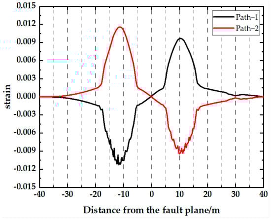 As shown in Figure 10, the maximum values of tensile strain and compressive strain were not symmetrical relative to the fault plane. Under minor fault displacements, the pipeline experienced lower overall strain levels without significant strain concentration. However, as fault displacement increased, specific pipeline segments exhibited enhanced strain concentration and more intense strain responses. Notably, the strain distribution along the tensile stress region of the pipeline remained relatively uniform.
