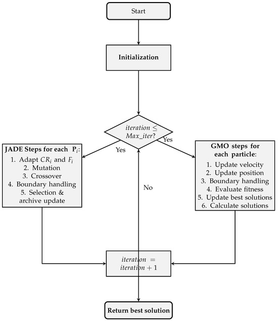 In this section, we detail the theoretical and empirical justifications for combining JADE (adaptive differential evolution with optional external archive [42] with GMO (geometric mean optimizer) to form the proposed hybrid algorithm. This design choice stemmed from our objective of achieving a robust balance between exploration and exploitation, while minimizing extensive parameter tuning and avoiding premature convergence.