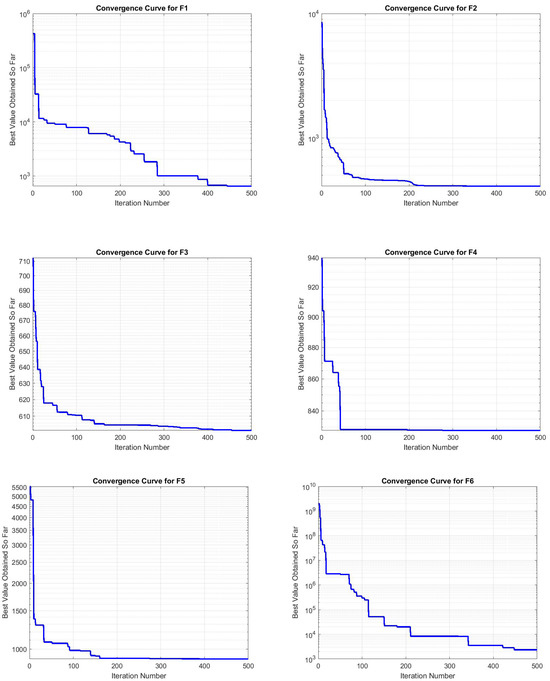 Convergence curve analysis for CEC2022 benchmark functions (F1–F6).