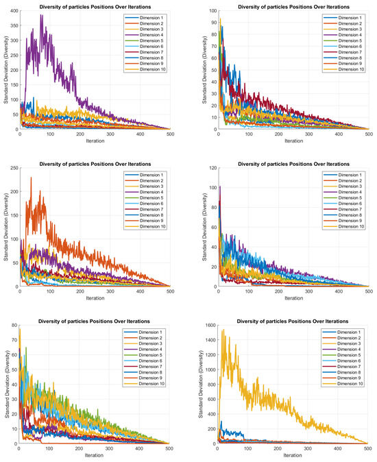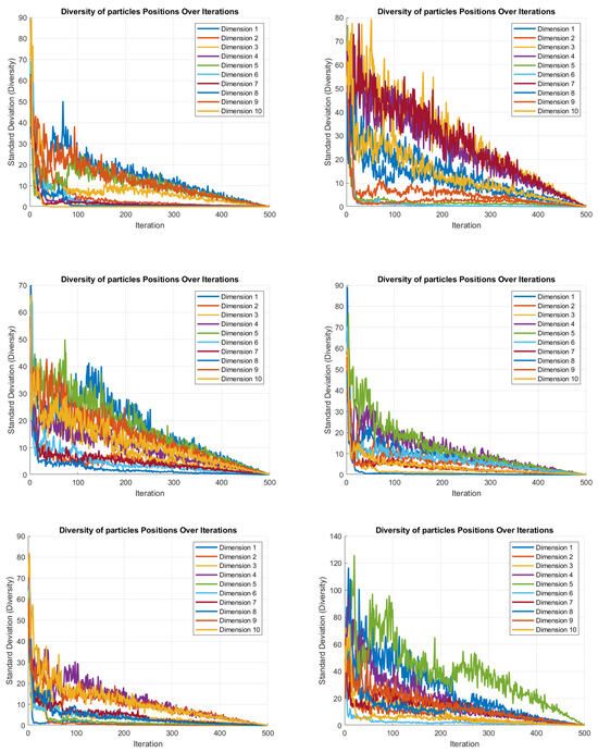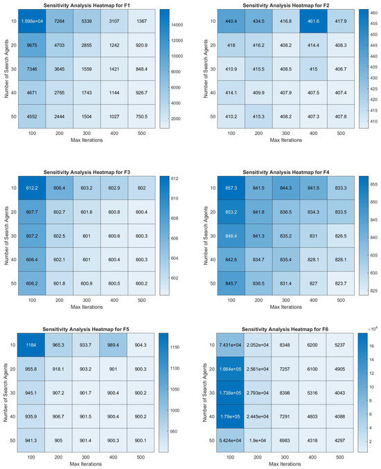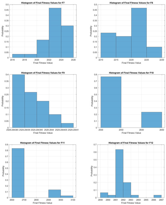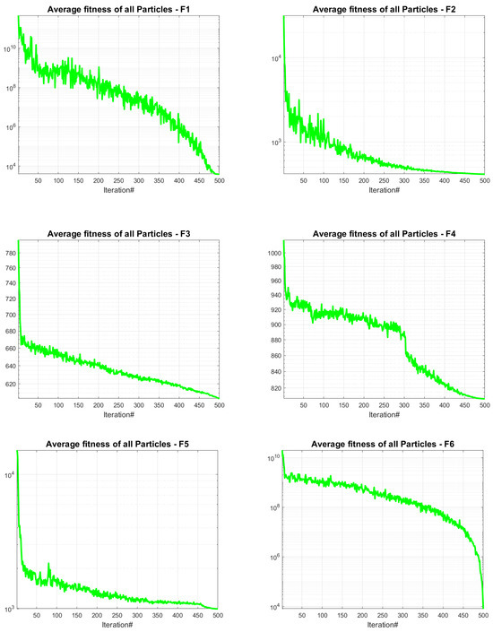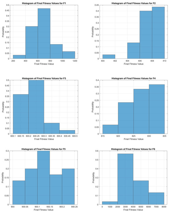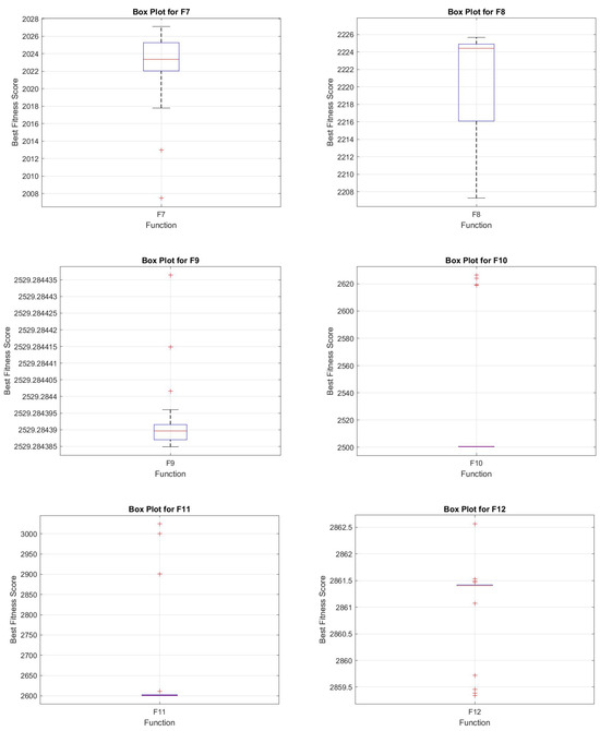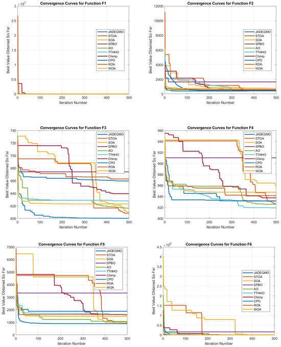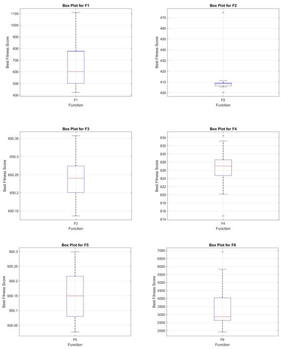 In Figure 3 and Figure 4, the convergence curves of functions F3, F5, and F6 demonstrate a pattern characterized by an initial rapid decrease in the objective function value, followed by phases of stagnation. This behavior suggests that the JADEGMO algorithm encounters challenges in further refining the solution after achieving an initial improvement, which is indicative of complex landscapes with numerous local optima. The intermittent plateaus observed in these curves imply that the algorithm might benefit from enhanced diversification strategies to avoid premature convergence. Moreover, the gradual downward trend seen in the later stages highlights the need for adaptive parameter tuning mechanisms that can dynamically adjust the exploration–exploitation balance to sustain progress and achieve better final solutions.