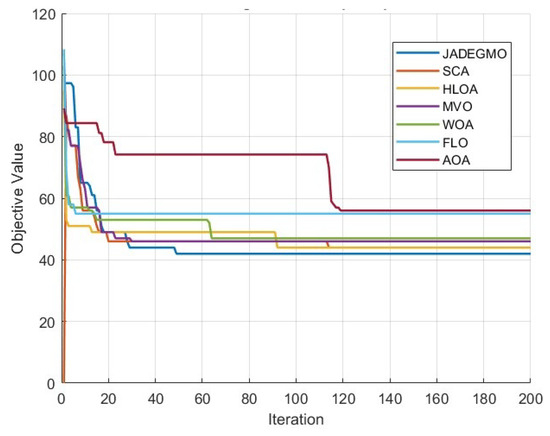 Table 4 displays the aggregated statistics over 30 runs for each of the seven algorithms. JADEGMO emerges as the top contender, achieving a minimum best cost of 42, a mean best cost near 47.47, and the most favorable average rank (1.40). SCA places second in average rank, while algorithms like HLOA, MVO, and WOA lie in the middle range with slightly higher costs and/or greater variability. FLO and AOA generally yield even higher final costs.