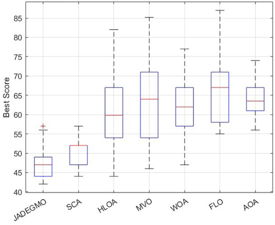 Figure 22 presents a box plot of the final best costs across all 30 runs. JADEGMO displays a comparatively lower median and a tight interquartile range. SCA’s distribution is also relatively compact but shifted upward. The others, including HLOA, MVO, WOA, FLO, and AOA, exhibit noticeably wider spreads or higher medians.
