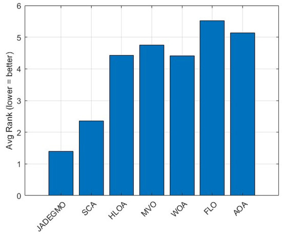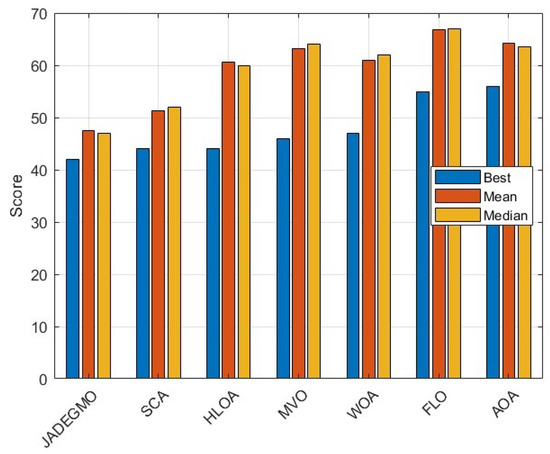 In Figure 23, we show the average ranks for each algorithm across the 30 runs. JADEGMO’s rank is roughly 1.40, indicating that it often achieves the best or near-best result. SCA is next-best ranked at around 2.35. HLOA, MVO, and WOA cluster around ranks of four to five, whereas FLO and AOA near or exceed an average rank of five. The grouped bar chart in Figure 24 further illustrates the best, mean, and median cost values per optimizer.