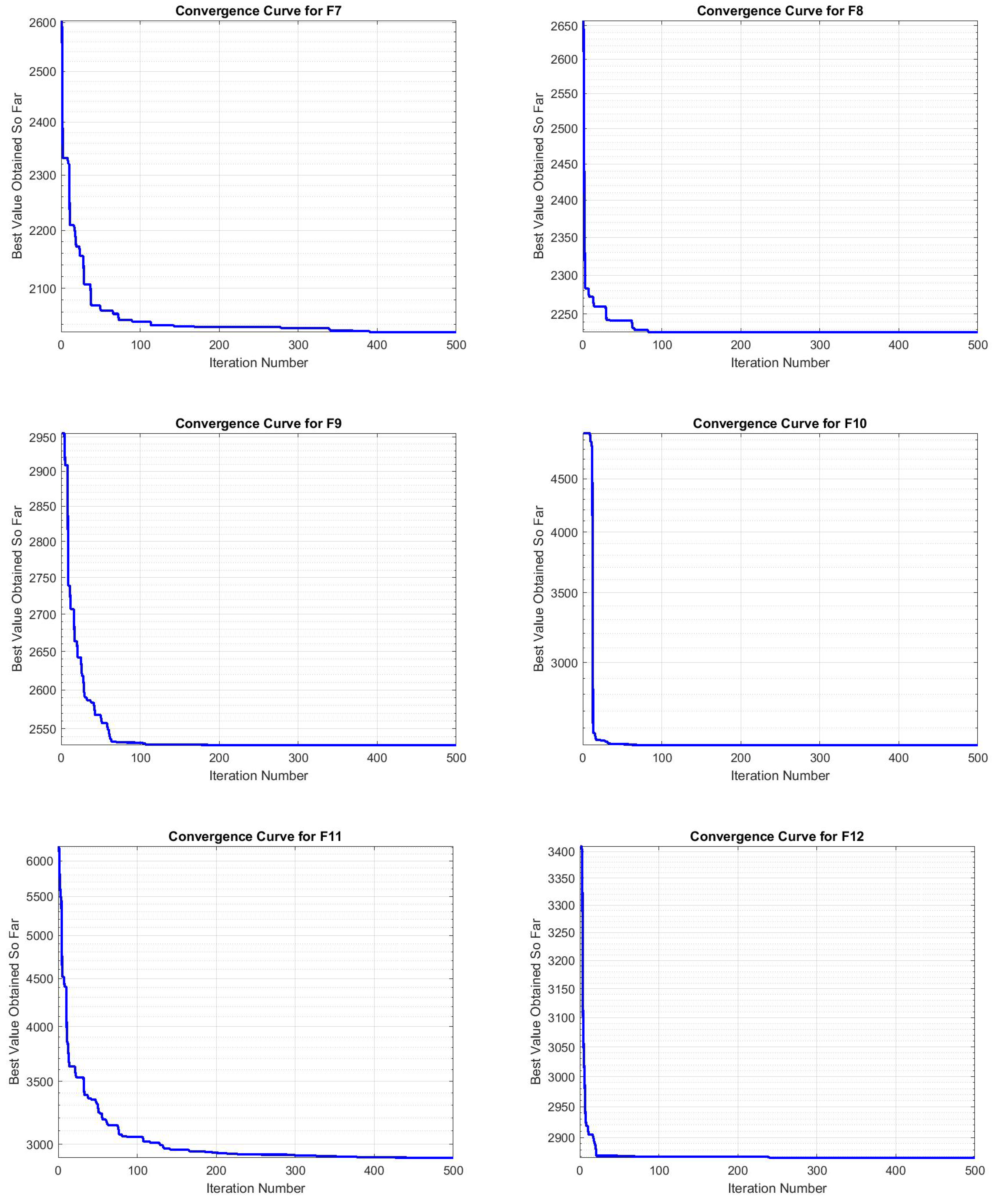 show significant fluctuations, which may indicate the algorithm’s struggle with complex landscapes characterized by multiple local optima or steep gradients. Functions