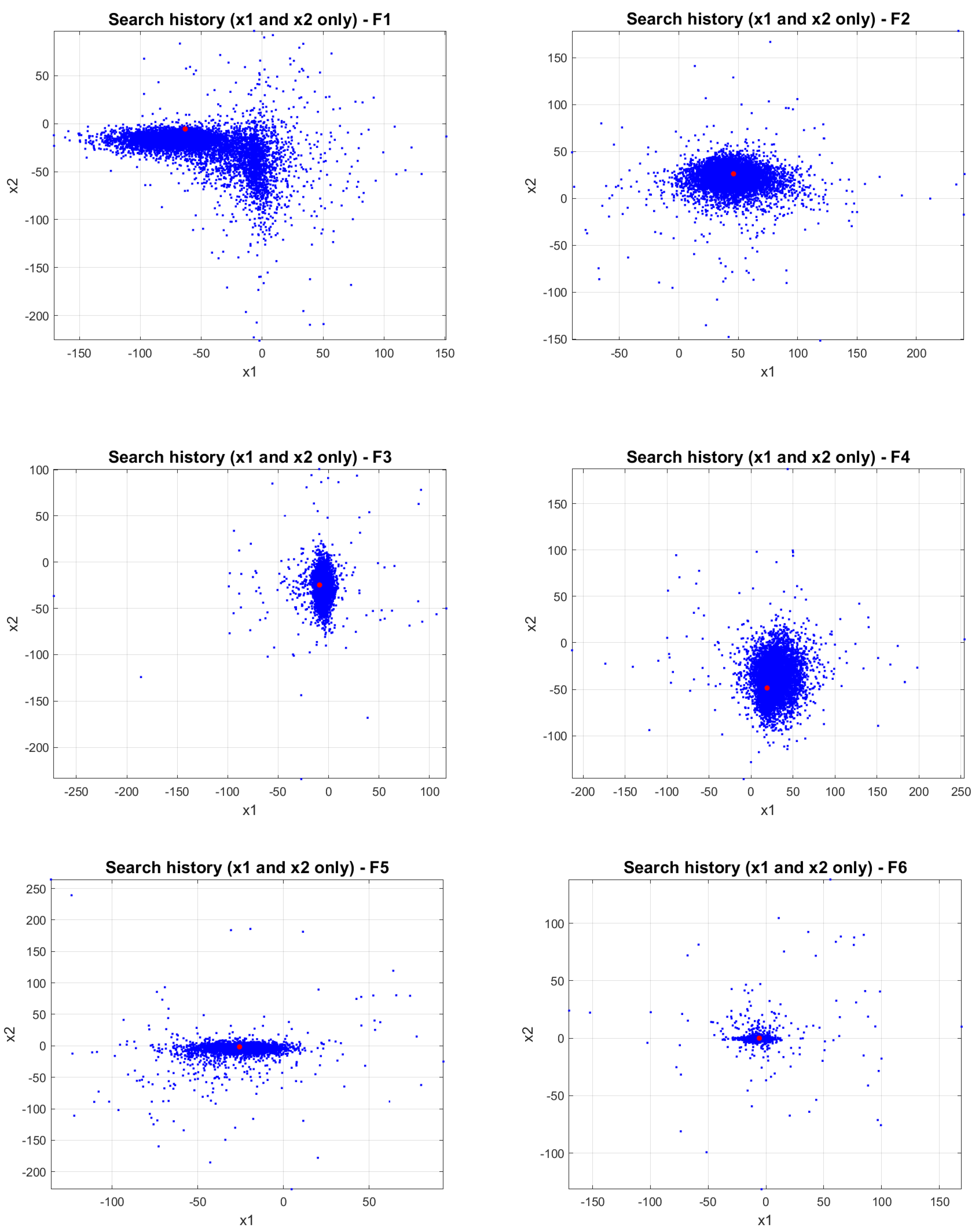 show a denser, centralized search pattern, reflecting effective exploitation amidst potentially challenging search landscapes with multiple local optima.