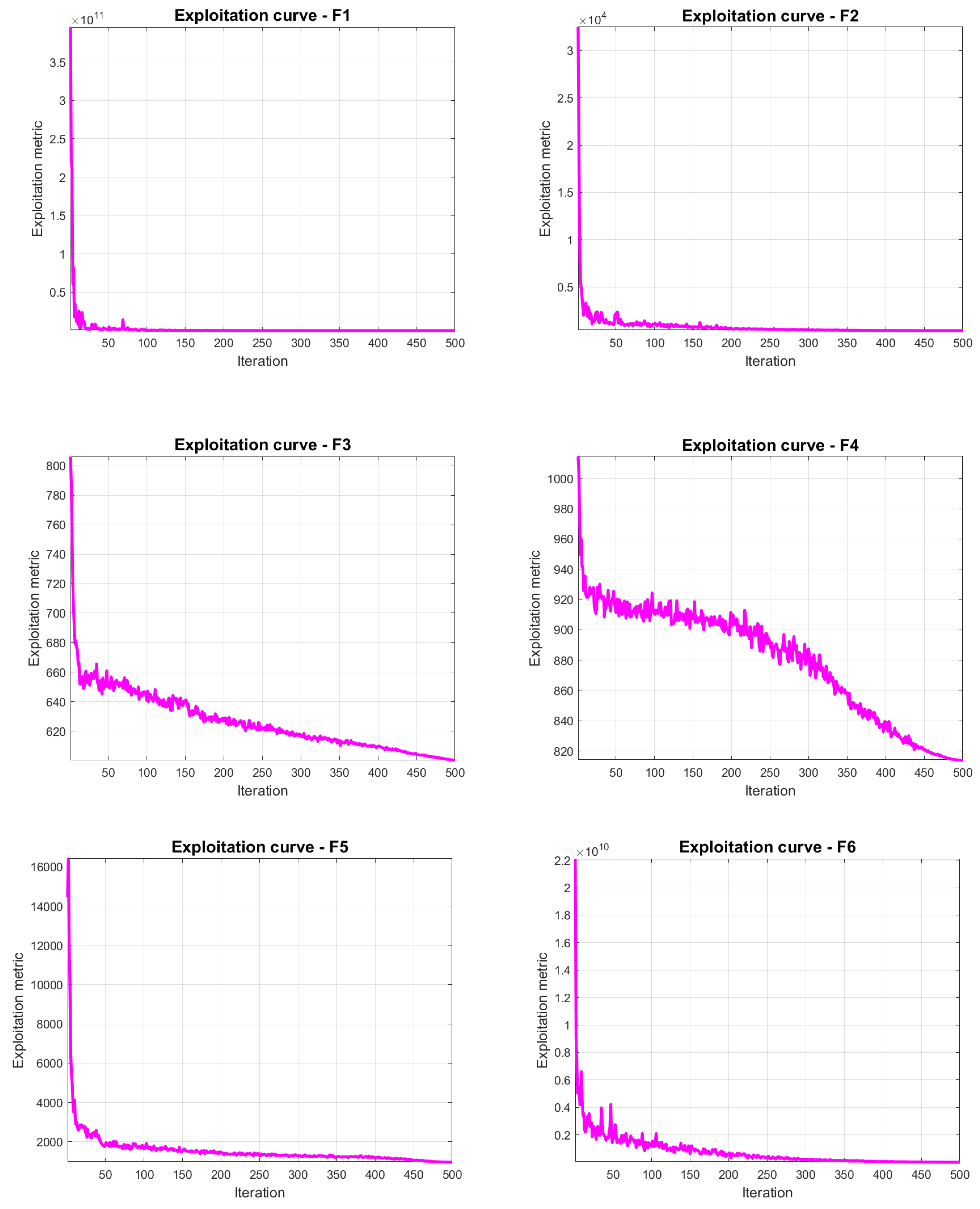 Figure 12, the exploitation metrics of JADEGMO JADEGMO over the CEC2022 benchmark for functions F1 to F12 reveal significant insights into its performance dynamics. Initially, for all functions, there is a steep drop in the exploitation metric, indicating rapid convergence towards regions of higher exploitation in the search space. This is particularly evident in the initial iterations where the algorithm aggressively exploits the potential solutions. As the iterations progress, the curves tend to flatten, suggesting a reduction in the rate of exploitation improvement. This behavior is consistent across all functions, with F1 and F2 showing a sharp initial decline before stabilizing, while functions like F5 and F11 display occasional spikes in later iterations, indicating intermittent explorations that potentially escape local optima.