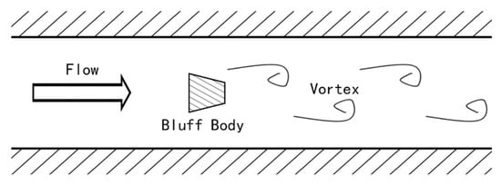 Under specific flow conditions, when a fluid medium passes through a bluff body, regular vortices alternate behind the bluff body, a phenomenon known as the Karman vortex street. The concept of symmetry plays a vital role in understanding this phenomenon. Symmetry in the geometric configuration of bluff bodies can significantly influence the formation and stability of vortices. In 1912, Von Kármán [] studied the stability of vortex streets, laying the theoretical foundation for vortex flowmeters. In industrial production, vortex flowmeters have the advantages of a simple, straight-curve structure, wide application range, and long service life.