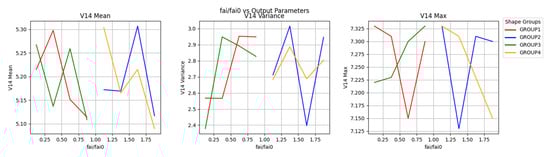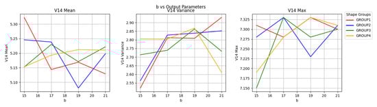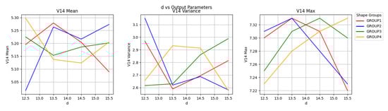 Figure 18 shows the relationship between c and V14. When the countercurrent surface is concave, when the parameter c increases to 3.5 mm, the maximum value of V14 in group III drops by 6.9%, while the mean and variance are almost unchanged, indicating that the turbulent separation characteristics change abruptly and the minimum value of V14 drops sharply under this shape. With the increase in the arc of the countercurrent surface, the maximum value of V14 will decrease sharply in a certain range. As the radius increases, the shape gradually deviates from the trapezoidal bluff body and becomes more similar to a semicircular bluff body.