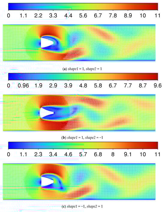 Figure 22a–d illustrates the velocity contour maps of four specific shapes. Among them, the forward convex arc results in a smaller deceleration zone in front of the bluff body and lower maximum velocities on both sides of the bluff body while the width of the vortex street increases. It is speculated that the convex arc may have a better guiding effect on the flow, directing it toward the sides, thereby making the actual effective length greater than d. The convex arc on the counterflow surface leads to a smaller low-speed zone behind the bluff body and a larger vortex street length.