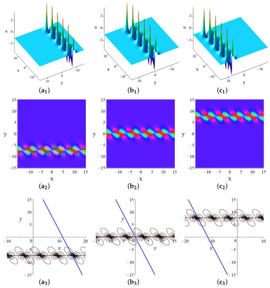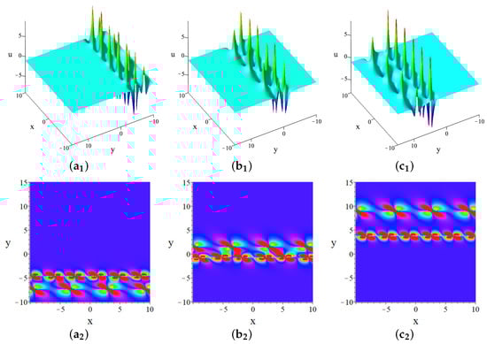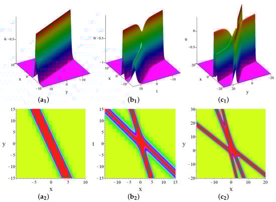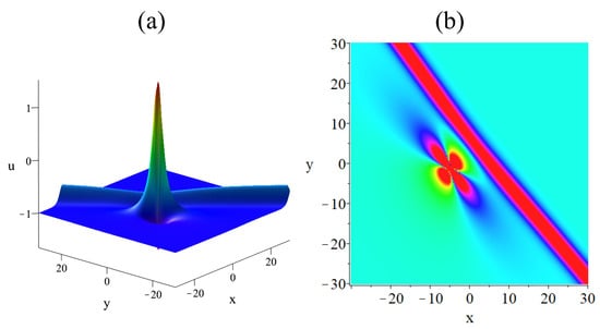 where the quadratic function represents a lump, and the exponential function represents a soliton. By substituting the above expression of f into (53) and collecting the coefficients of x, y, t, and , we solve the resulting polynomial system to obtain three sets of representative parameters. The first set: