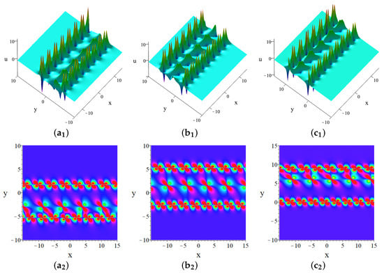In the first set of parameters, , which implies that the line soliton solution does not exist, and only a lump solution can be obtained. The second and third sets of parameters both allow for an interaction solution between one lump and one soliton. For further analysis, we select the second set of parameters, resulting in