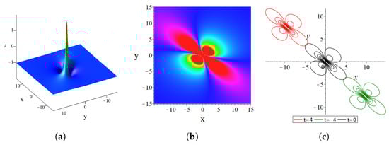 Figure 5 presents the plots of the first-order lump solution. The left (Figure 5a) panel shows the three-dimensional visualization, the middle panel (Figure 5b) displays the density map, and the right panel (Figure 5c) illustrates the temporal evolution. These visualizations provide insights into the spatial and temporal characteristics of the lump solution. Here, , where and are the real and imaginary parts, respectively. To avoid singularities, the real part must be non-zero. For a fixed time t, as , the lump solution , indicating that the lump propagates on a constant background. At , the critical points of the first-order lump solution are obtained by solving and . The results are as follows: maximum peak amplitude at the point and minimum peak amplitude at the points . However, due to the reduction condition, the ANNV Equation (1) supports only a first-order lump solution.