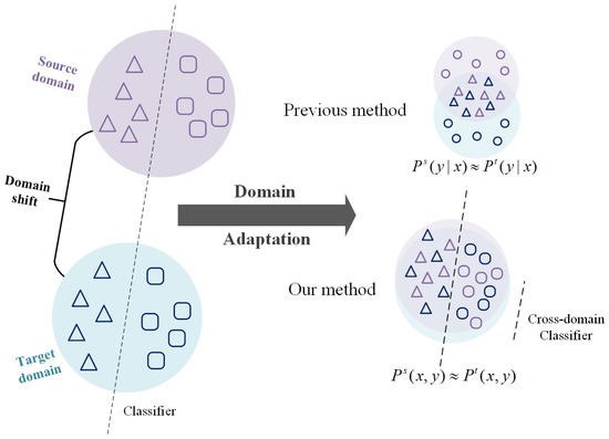 Joint distribution matching aligns the joint distributions of the source and target domains by considering both class-conditional information and label information. By integrating adversarial training methods with label information, joint distribution matching enables the model to bridge the gap between marginal distributions while precisely ensuring feature alignment across categories. Specifically, joint distribution matching seeks to align the source joint distribution with the target joint distribution . This alignment is achieved by minimizing joint distribution discrepancy [34,35] or optimal transformation [36]. Joint distribution matching can effectively reduce the distribution bias between domains to enhance the model’s generalization ability. However, in an unsupervised domain adaptation setting, the absence of labels in the target domain still makes the joint distribution estimation difficult.