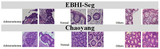 We utilized the EBHI-Seg dataset https://figshare.com/articles/dataset/EBHI-SEG/21540159/1 (accessed on 11 November 2022) as the source domain, which consists of histopathological images from colonoscopy biopsies. The dataset comprises 3904 images divided into six tumor differentiation stages: normal, polyp, low-grade, and high-grade intraepithelial neoplasia, serrated adenoma, and adenocarcinoma. We employed the colon section dataset from Chaoyang Hospital [58] for the target domain. This dataset, annotated by three expert pathologists, consists of 512 × 512 pixel images and includes four categories: normal, serrated, adenoma, and adenocarcinoma. Our experiment merged the categories into three groups: normal, adenoma, and other types of colon diseases. The image resolution was standardized to 224 × 224 pixels.