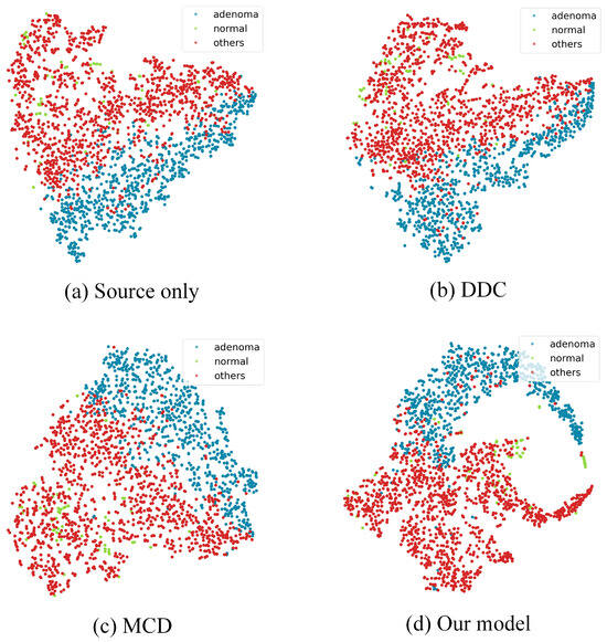 t-SNE visualization of the categories: (a) without adaptation, (b) after DDC adaptation, (c) after MCD adaptation, and (d) after adaptation with our model. Adenoma is represented in blue, normal in green, and other types in red.