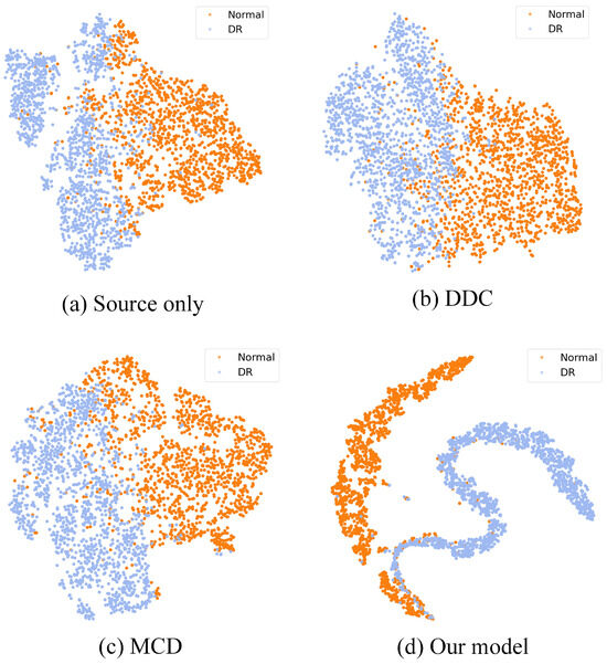 t-SNE visualization of the categories: (a) without adaptation, (b) after DDC adaptation, (c) after MCD adaptation, and (d) after adaptation with our model. Normal is shown in orange, and DR is shown in light blue.