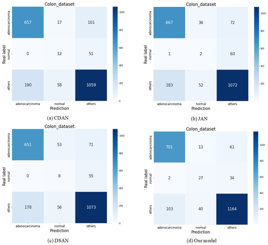 Figure 7 illustrates the confusion matrices of four models—CDAN (Figure 7a), JAN (Figure 7b), DSAN (Figure 7c), and our proposed model (Figure 7d)—providing an intuitive overview of the experimental results. In the “Adenocarcinoma” class, our model demonstrated outstanding performance, achieving only 61 false positives (FP), which is significantly lower compared to CDAN (101), JAN (72), and DSAN (71). Moreover, in the same class, our approach achieved the lowest false negatives (FN), with only 103 cases, markedly better than CDAN (190), JAN (183), and DSAN (178). These experimental results highlight the effectiveness of our proposed model in addressing class imbalance and optimizing critical metrics such as FP and FN, further substantiating its potential applicability in real-world medical diagnostic systems.