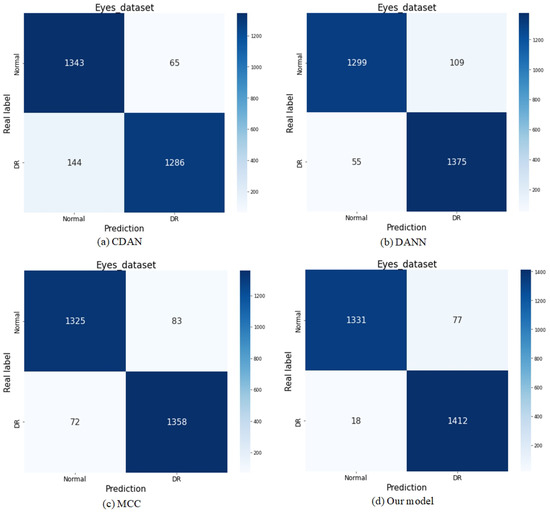 We visualized confusion matrices (shown in Figure 8) to better understand and analyze the experimental outcomes. Each row corresponds to the actual class in these confusion matrices, while each column represents the predicted class. Our model effectively optimized false positives (FP) and false negatives (FN), leading to notable improvements in these metrics. Specifically, for the “Normal” class, the reduction in false positives was substantial, highlighting the model’s enhanced ability to identify standard samples accurately. For the “DR” class, the number of false negatives decreased to 18, the lowest among all compared models, highlighting the model’s exceptional sensitivity in detecting diseased samples. This dual optimization holds critical clinical significance in real-world applications: on the one hand, reducing false positives lowers the risk of misdiagnosing regular patients, alleviating unnecessary medical burden; on the other hand, minimizing false negatives improves the early diagnosis rate of diseased patients, ensuring timely treatment and better prognosis.