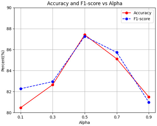 For the diabetic retinopathy classification task (Table 5), using only the classification loss () yielded limited performance, with an accuracy and F1 score of 88.61%. Introducing the joint distribution alignment loss () improved the accuracy and F1 score to 91.64%. Further incorporating the consistency regularization loss () led to significant improvements, with all metrics exceeding 96.90%. Specifically, the model achieved an accuracy and F1 score of 96.93%.
