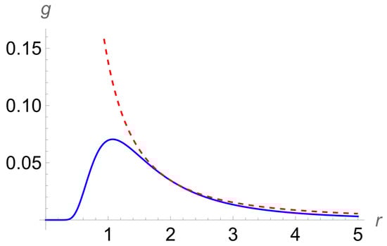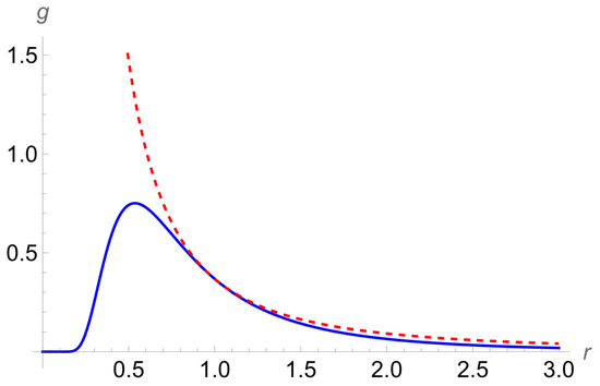 For illustrating the perfect match in more detail, we provide Figure 6 showing, by the solid line, gint(r) from Equation (35) and, by the dashed line, gext(r) from Equation (38). It is seen that at R = 2, there is a smooth transition from the solid line to the dashed line.